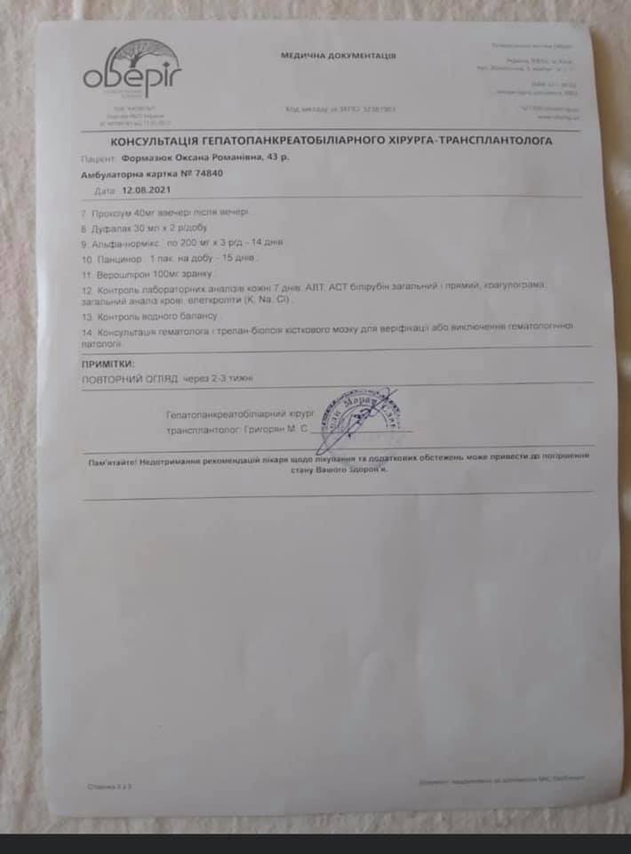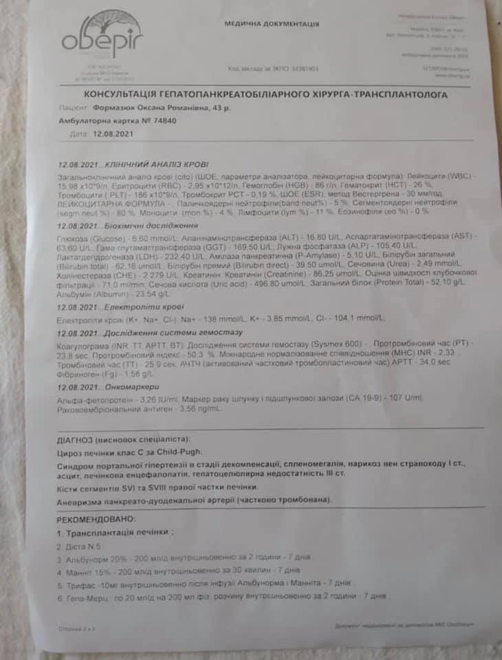 «У неї цироз печінки, зараз на підтримувальній терапії в Києві, назначено трансплантацію не швидше ніж на 20 вересня, оскільки організм ще не готовий для таких маніпуляцій! Наразі вона лежить в реанімації, доба перебування там 30 тис. грн. Нам дуже потрібна допомога, щоб продовжити їй життя і дочекатись пересадки. Потім потрібна тривала реабілітація, яка також коштує чимало, але зараз ми прагнемо зберегти життя та дочекатись трансплантації», – розповіла донька.