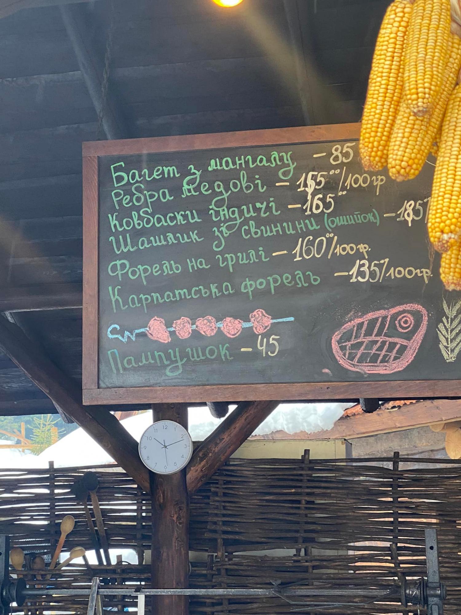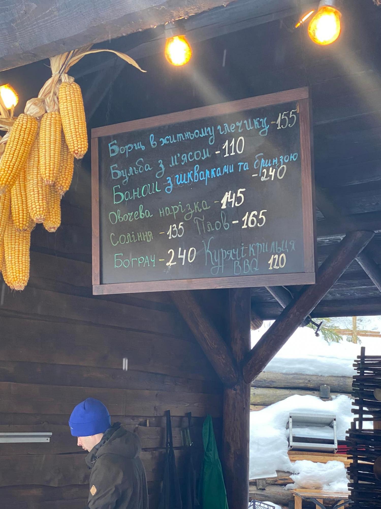 На цінниках зазначено, що гостям курорту пропонують скуштувати овочеву нарізку по 145 гривень, порцію плову за 165 гривень, банош зі шкварками та бринзою за 240 гривень, сік “Річ” (0,2 л) за 75 гривень, мінералку за 55 гривень, пиво від 135 до 155 гривень за келих, коньяк (50 грамів) за 120 гривень, багет з мангала за 85 гривень та інше.