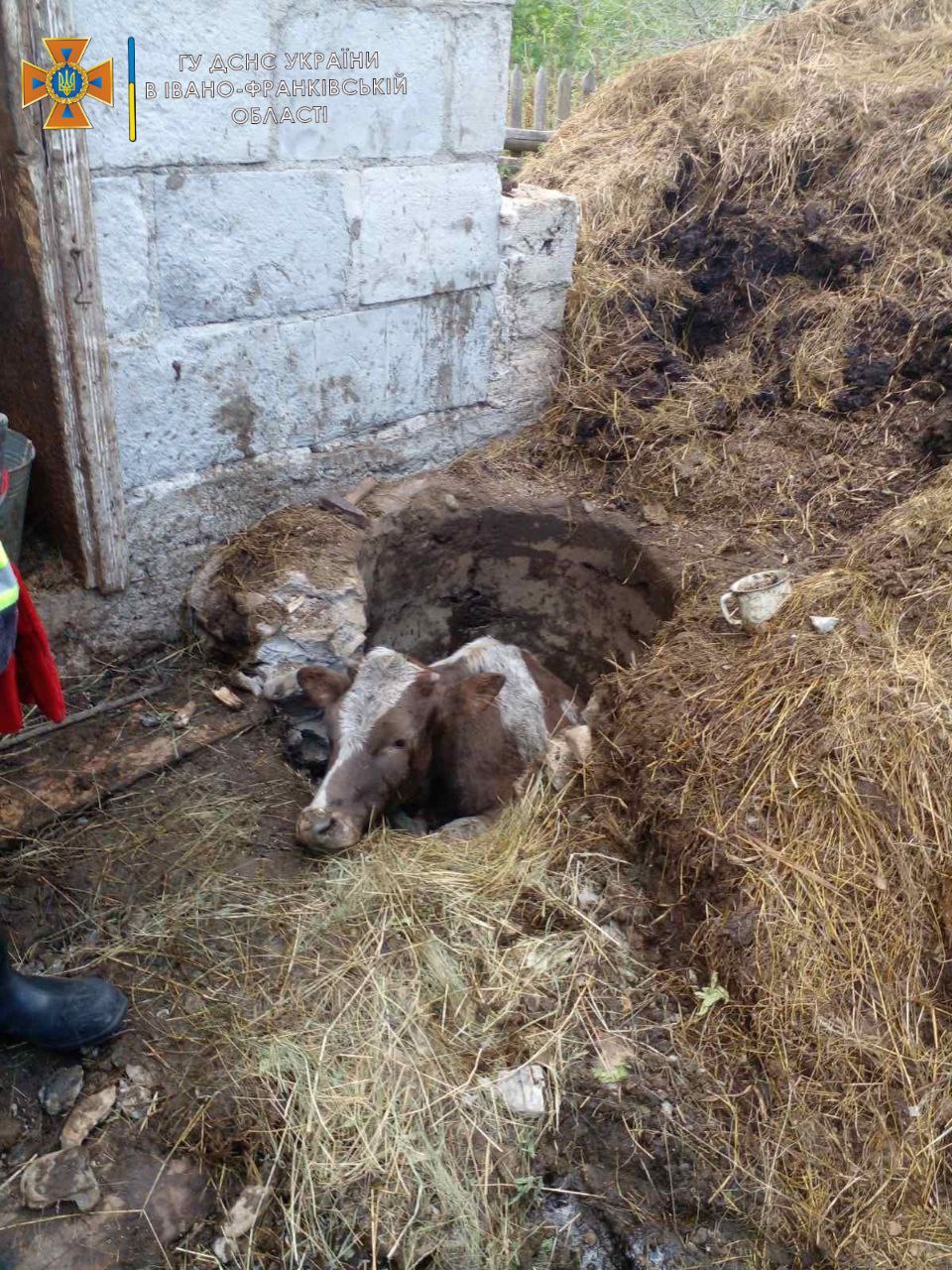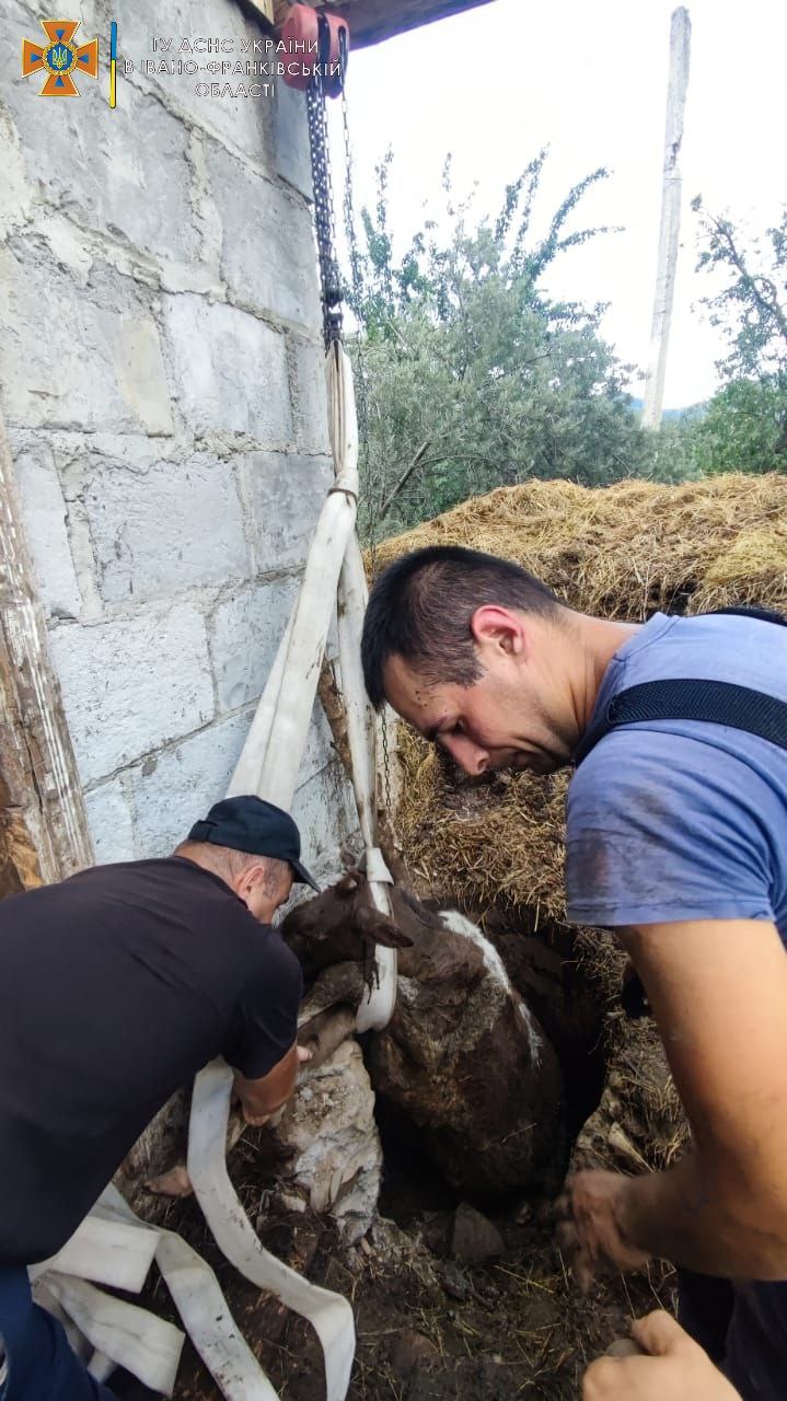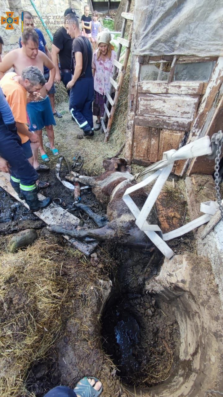 6 серпня о 15:50 до Служби порятунку надійшло повідомлення про те, що в селі Пороги Івано-Фраківського району, корова впала у вигрібну яму та не може самостійно вибратись.