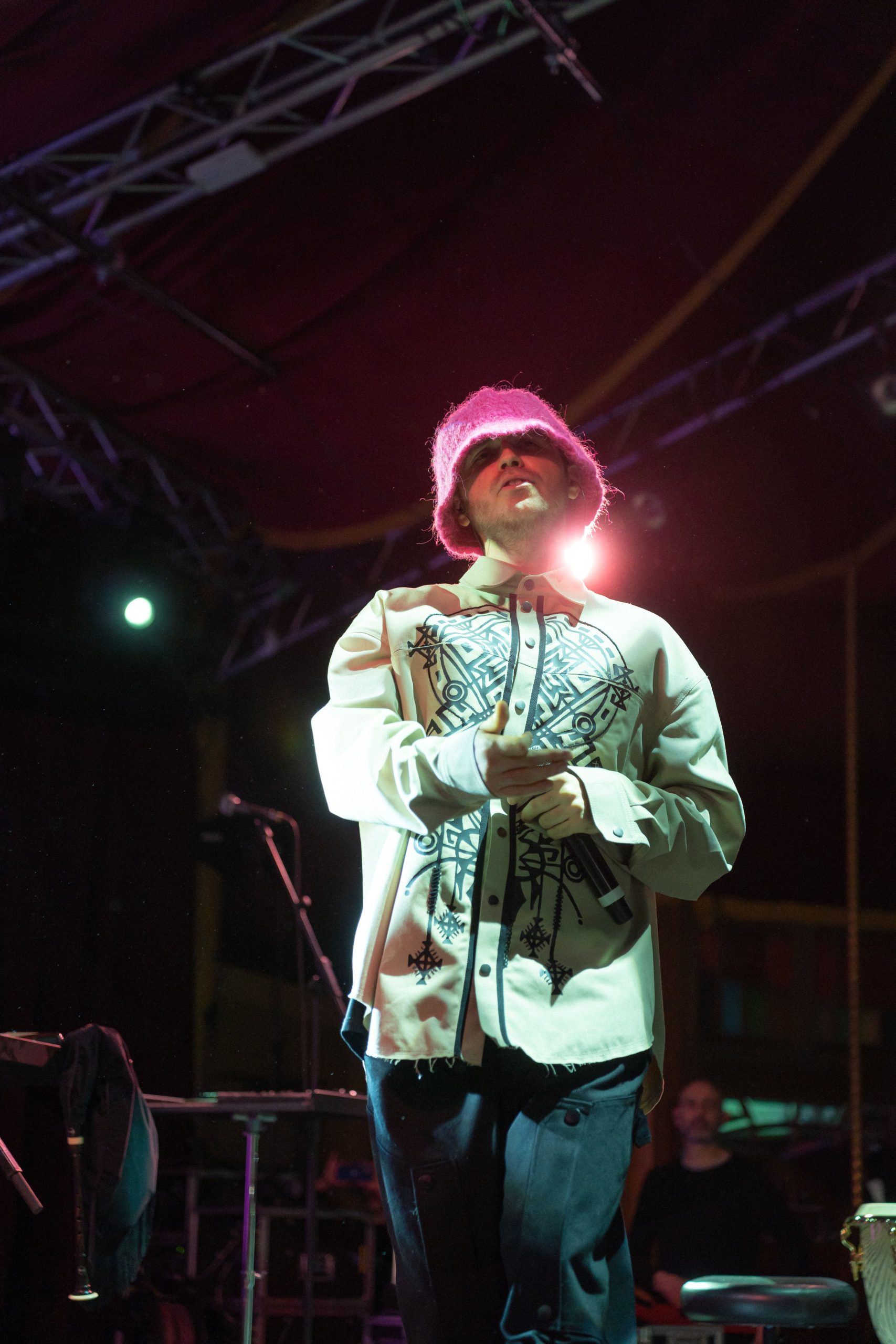 Лідер Kalush Orchestra Олег Псюк зняв кептар та одягнув сорочку, яка теж стилізована орнаментом.