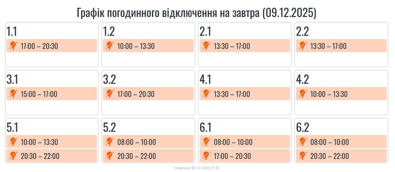 У вівторок, 9 грудня, на Івано-Франківщині протягом доби будуть діяти графіки погодинних вимкнень електроенергії.