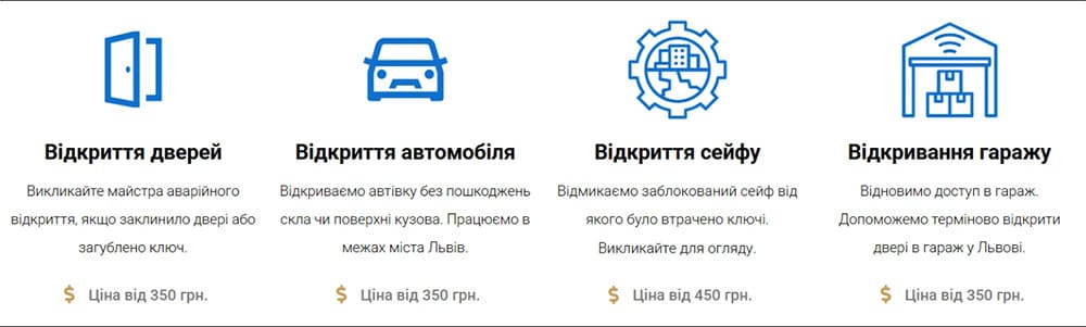 Служба аварійного відкриття замків у Львові Lockopenservice.com спеціалізується на безпшкодному злому дверей, сейфів та авто. Заснована досвідченими майстрами, компанія забезпечує гарантію якості, фіксовані ціни та виїзд до 30 хвилин. Контактний номер: +38 (097) 307-88-28. Швидке відкриття замка дверей у квартирі чи офісі (залежно від складності замка) буде коштувати від 700 гривень. Термінове відкриття замка дверей в автомобілі (залежно від марки) від 800 гривень. Не ризикуйте майном, звертайтеся до професіоналів за першої потреби. Телефонуйте та переконайтеся в надійності сервісу!